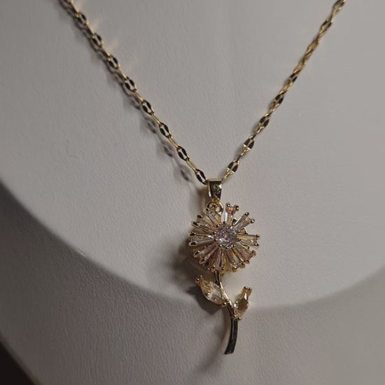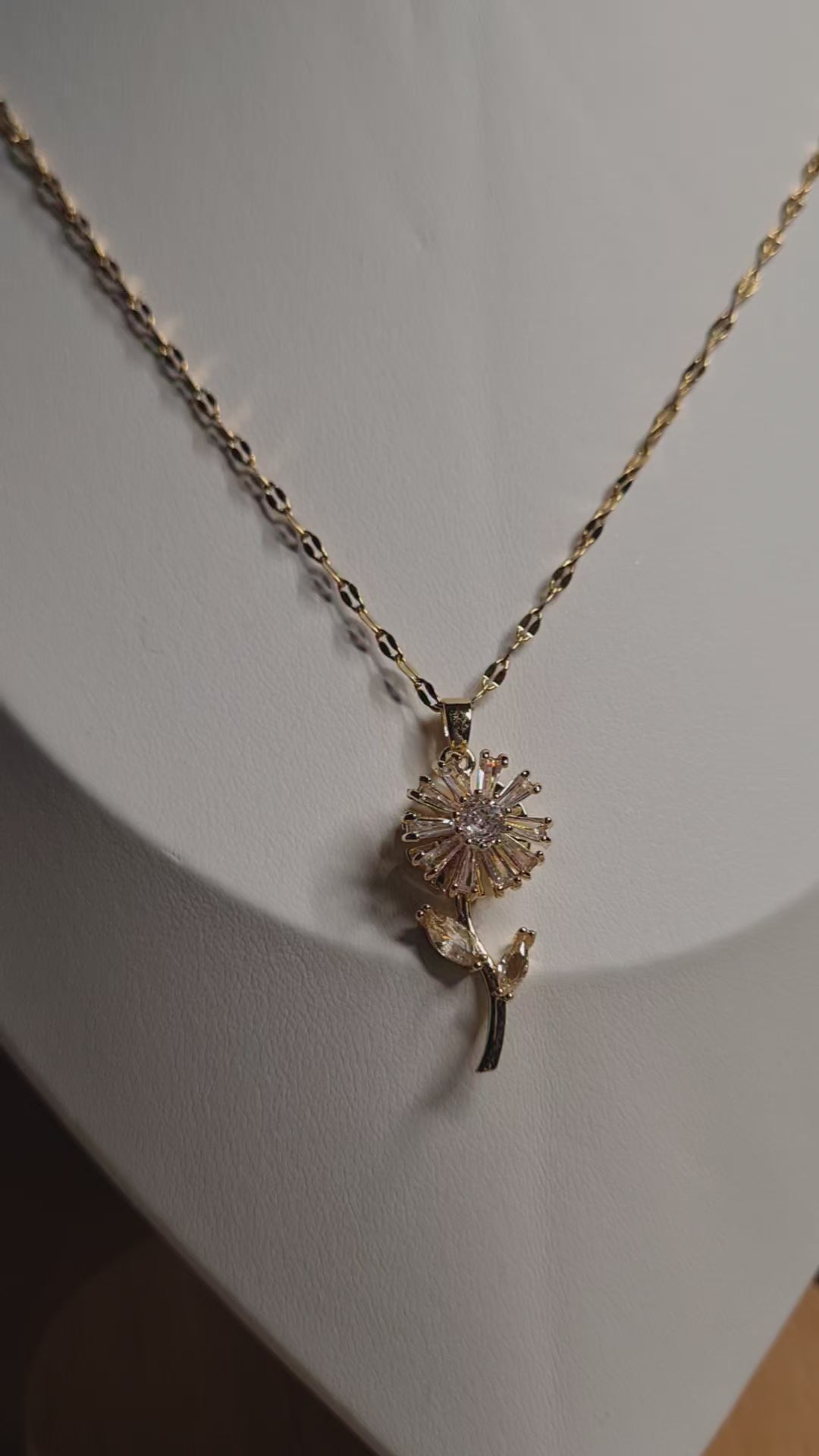 Sublimez votre style avec ce magnifique collier en acier inoxydable doré, conçu pour allier élégance et durabilité. Son pendentif raffiné en forme de fleur scintillante est orné de pierres lumineuses, capturant la lumière à chaque mouvement.